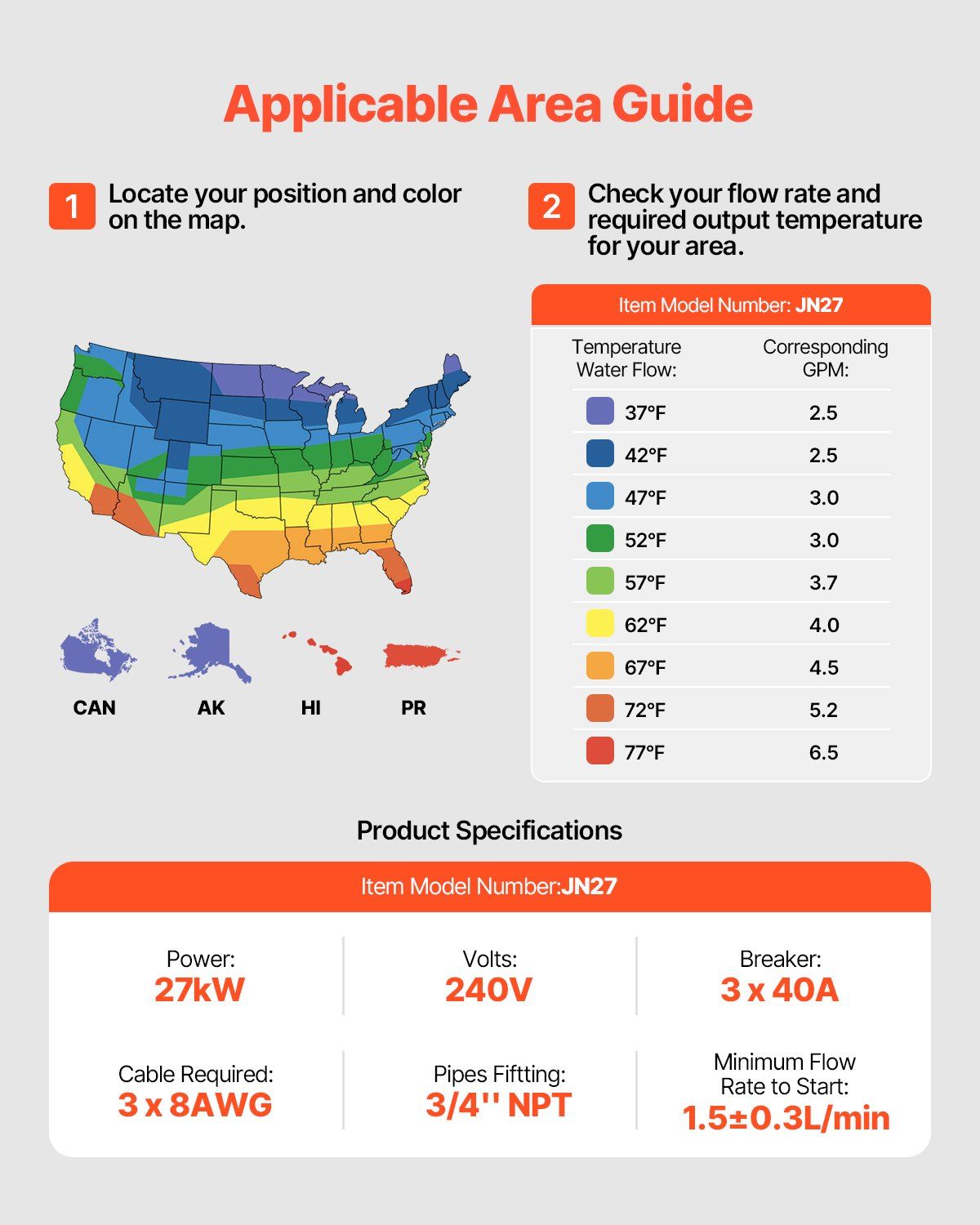 4.Easy Installation: We include a 3/4'' NPT inlet/outlet, and the installation requires 3x40A circuit breakers and 6 pieces of 8AWG wire. The instant water heater comes with detailed installation instructions for easy setup